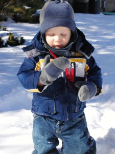Ten minutes of bundling for five minutes of play. Such is the way with little ones. He was not a big fan of the mittens, or the snow that stuck to them. He managed to shake the mittens right off so many times that I finally gave up and let him play until I could tell his hands were cold. But it was well worth the bundling to see him in his snow gear.
