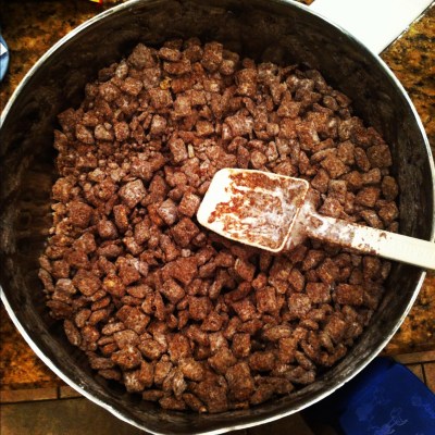 And then, after we got home from dinner, came the obligatory muddy buddies. My sister keeps a pantry like my mom, so there are always muddy buddy ingredii (yeah, that’s not a word, but it’s what we say) on hand. These are probably my most favorite treat ever.